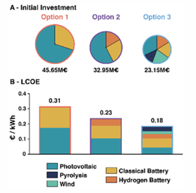 Frontiers, 550774 ; Cauz et al. Benefits of a diversified energy mix for islanded systems ; Le LCOE correspond au coût de production du mix énergétique